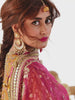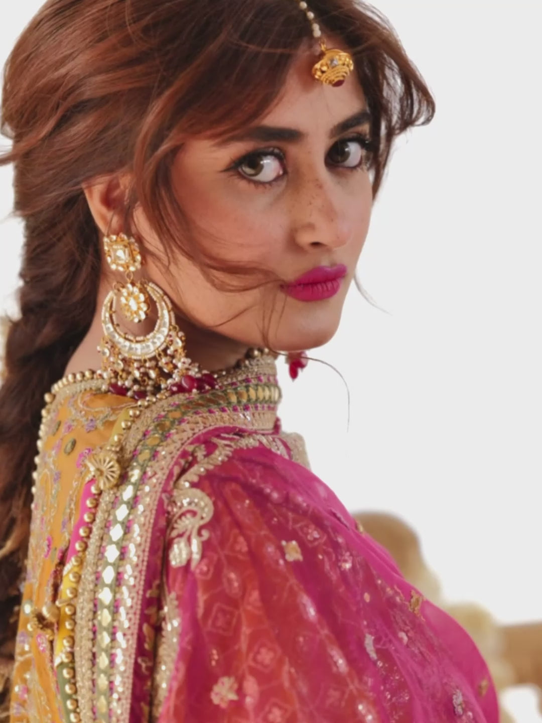 Sajal poses away in Kesari, rustic shades of mustard packed with a punch of our signature atishi gulabi. It features a lose fit Kashmiri phiran style kameez doused in a beautiful jaal of embroidered floral vines and carefully placed signature motifs enhanced by hand embellished accents of gota, hand cutsequins, pearls and cutdana . It comes with a generously embroidered sharara with heavy borders and an atishi gulabi dupatta with a delicate spray of floral motifs framed with chunky embroidered borders with dainty paisleys and geometric lines.